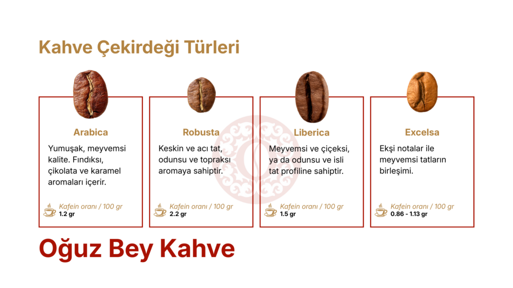 Dünya genelinde dört çeşit ana kahve çekirdeği vardır. Bunlar: Arabica, Robusta, Liberica ve Excelsa. Bu dört çeşit kahve çekirdeği arasında en bilinenleri Arabica ve Robusta’dır.